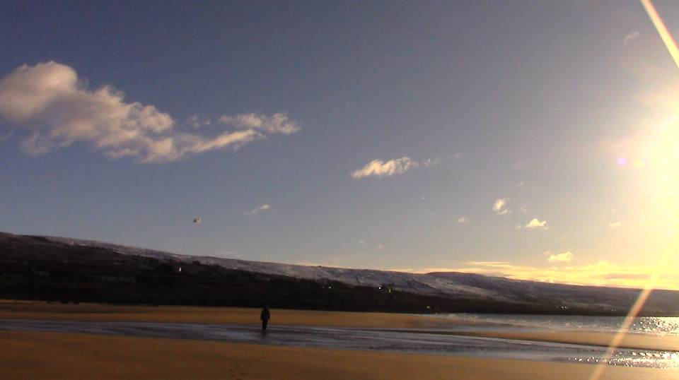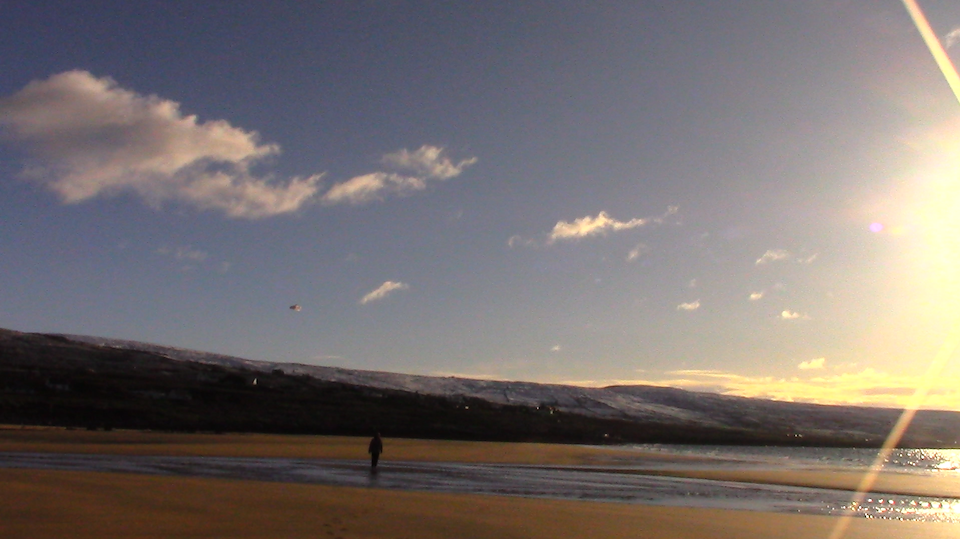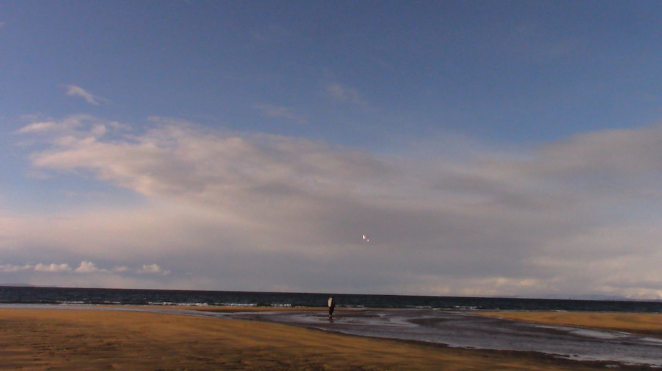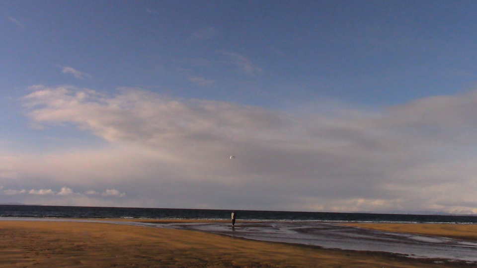 hand sewn kite and wooden mouth bridle, holding the body at a forward lean in the coastal wind.